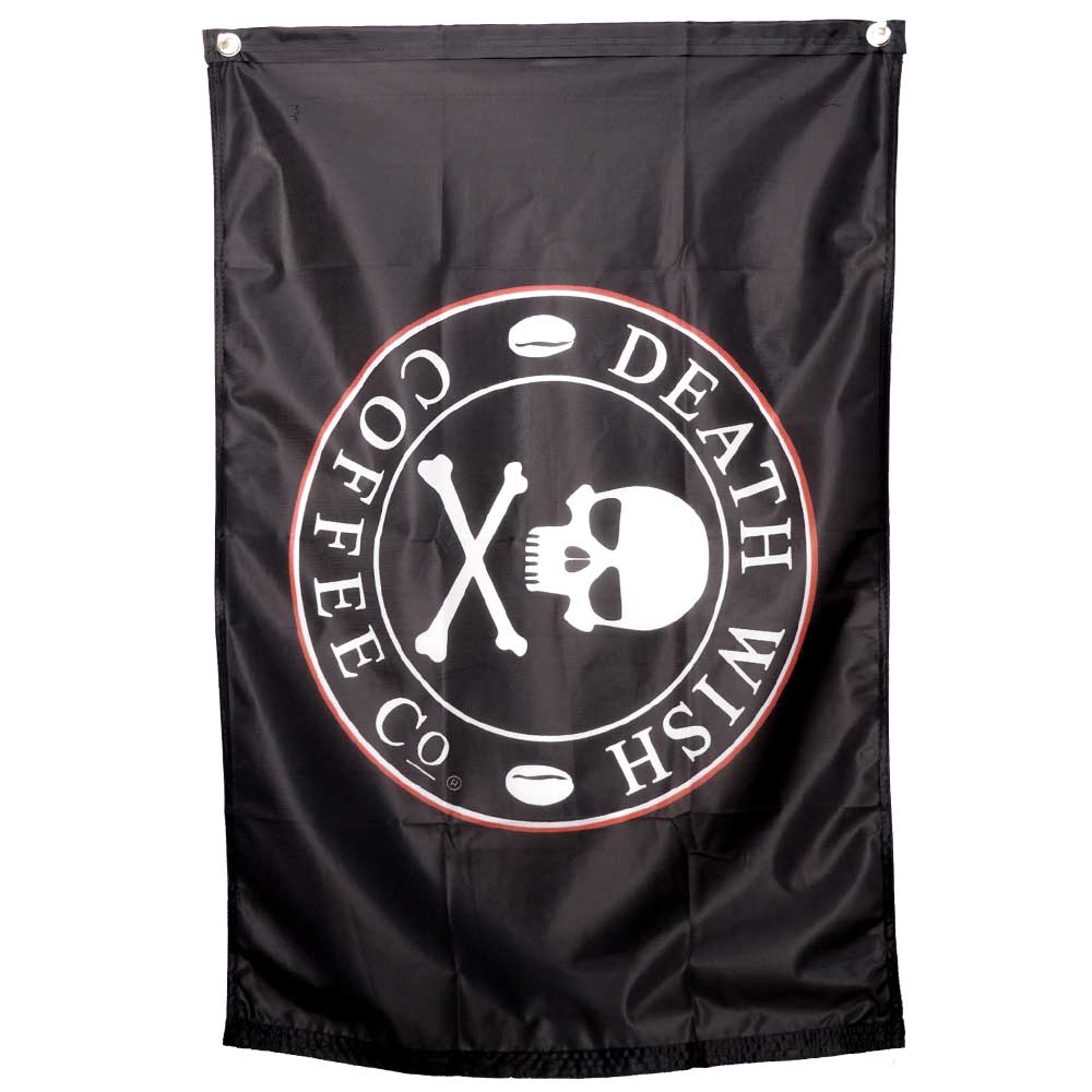 Show your Death Wish pride all year long. Display your Death Wish pride all year long with our latest flag that's even durable enough to handle outdoor weather. This black flag features our skull and crossbones logo so you can warn everyone around you that you're always ready for battle. Full details: Measures 2 ft. by 3 ft. Two rows of stitching to keep it from wearing down. Made from polyester for durable outdoor use. Heavy duty flag header material and standard fixture eyelets so you can h